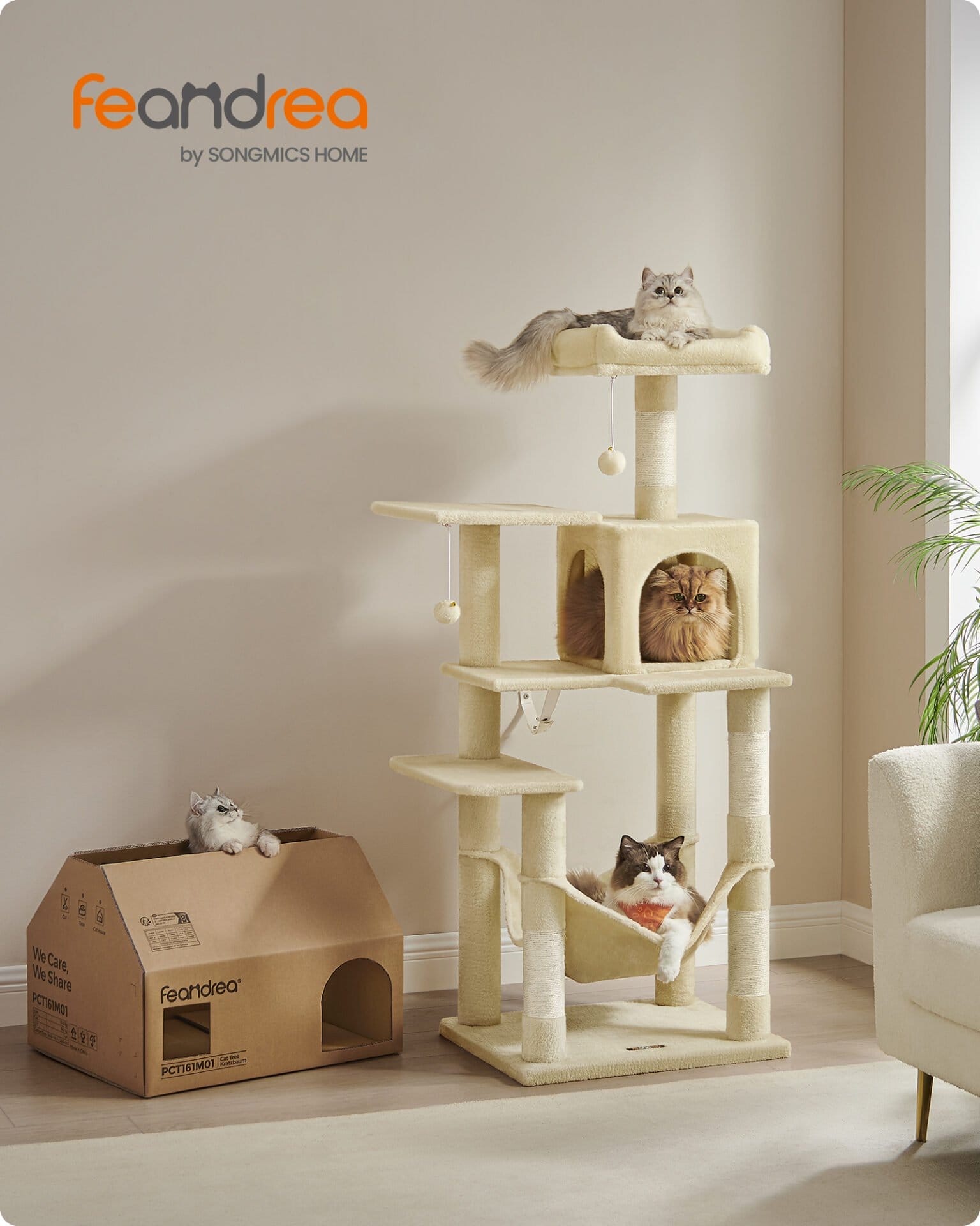 Specifications:Colour: BeigeMaterial: Particleboard, Plush, SisalProduct Size: 21.7″L x 17.7″W x 56.3″H (55 x 45 x 143 cm)Product Weight: 28.7 lb (13 kg)Max. Static Load Capacity Total: 88 lb (40 kg)Ideal Cat Quantity: Up to 4 Cats, Each ≤ 11 lb (5 kg)Package Contents:1 x Cat Tree1 x Anti-Tip Kit1 x Accessory Kit1 x Instructions