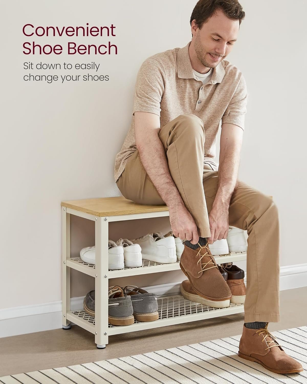[Bygget til at holde] Den robuste skobænk er fremstillet af en robust stålramme og spånplade og kan holde til op til 90 kg; så hvorfor ikke sidde ned og være komfortabel, mens du binder dine sko eller venter på, at andre gør sig klar?