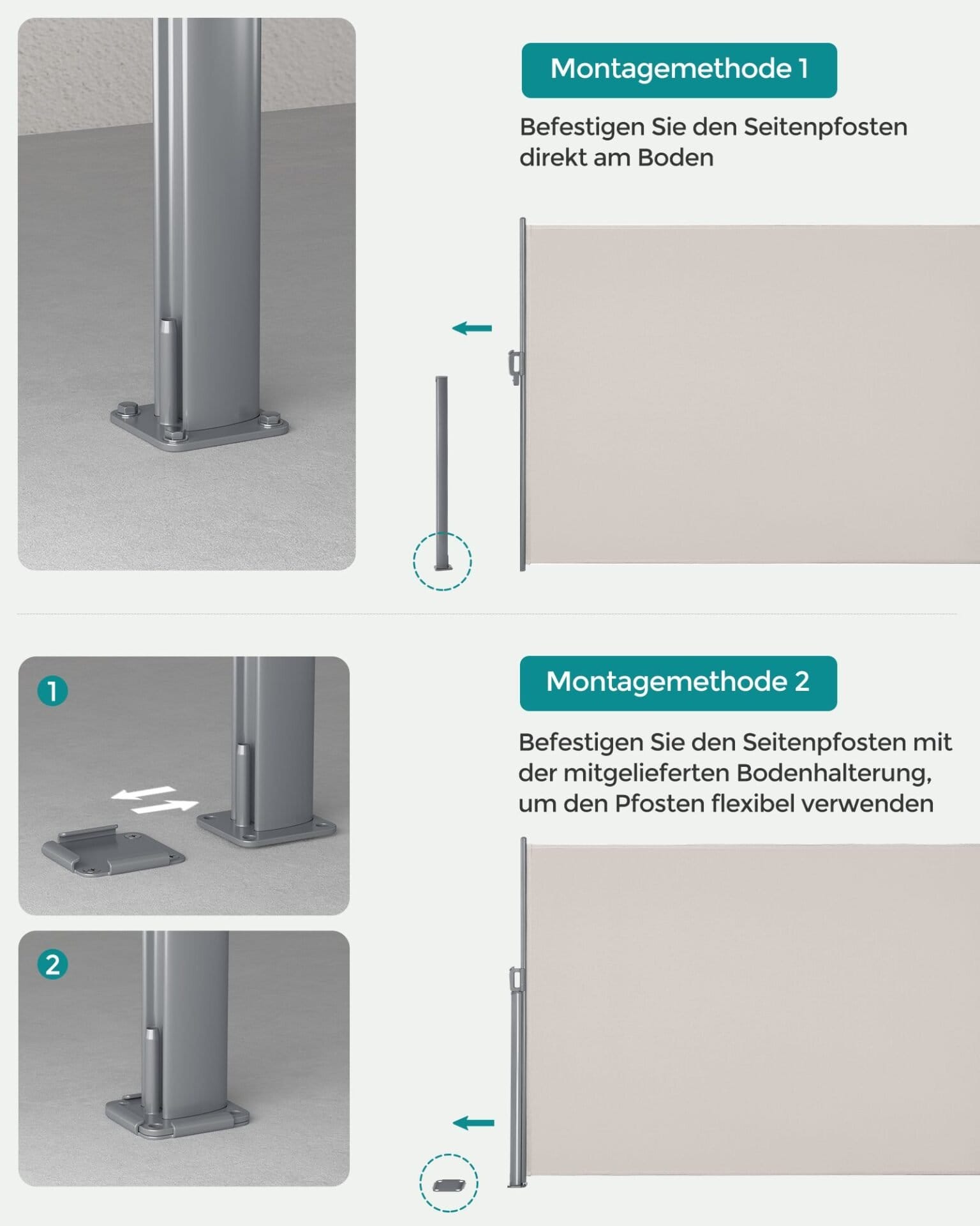 2 installation options: use the included ground bracket on a fixed ground and slide the side post in. Or attach the post directly to the ground if you want a more permanent installation