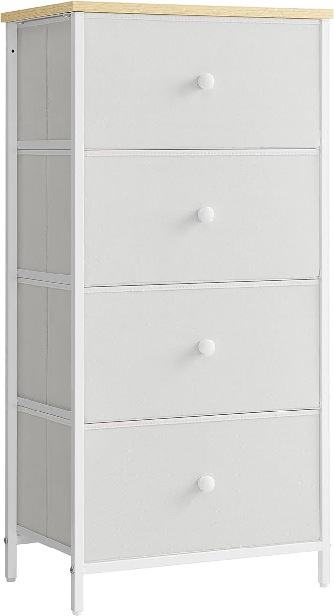 SONGMICS Chest of Drawers Bedroom, Drawer Storage Unit, Dresser with 4 Fabric Drawers, Metal Frame, Tall and Slim, for Closet, White and Oak LTS314W57SONGMICS Chest of Drawers Bedroom, Drawer Storage Unit, Dresser with 4 Fabric Drawers, Metal Frame, Tall and Slim, for Closet, White and Oak LTS314W57
