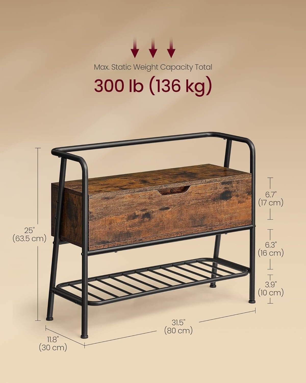 [Sturdy and Durable] Made from particleboard and steel, this shoe rack can withstand up to 136 kg, ensuring long-lasting durability. Sit back and change shoes in comfort