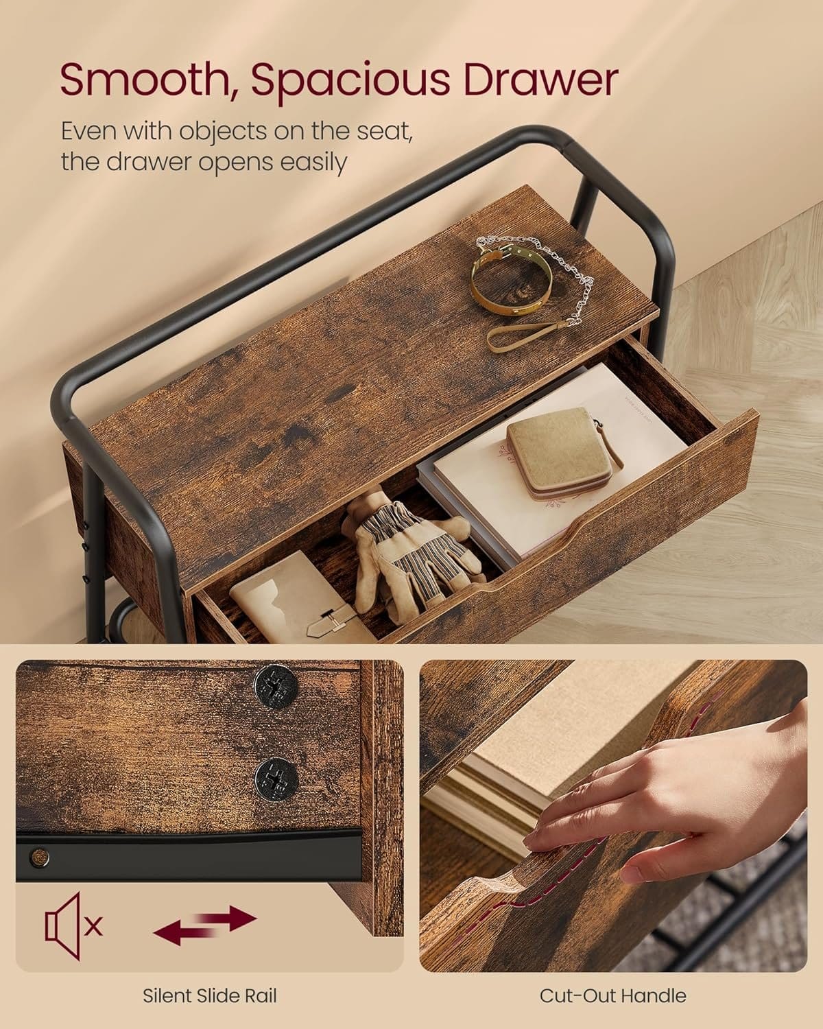 [4 Storage Areas] With a spacing of 10 cm from the bottom and 16 cm in the middle, this bench offers space for 6 to 8 pairs of shoes. The 17 cm deep drawer provides ample storage space, while the top is perfect for your handbags or accessories