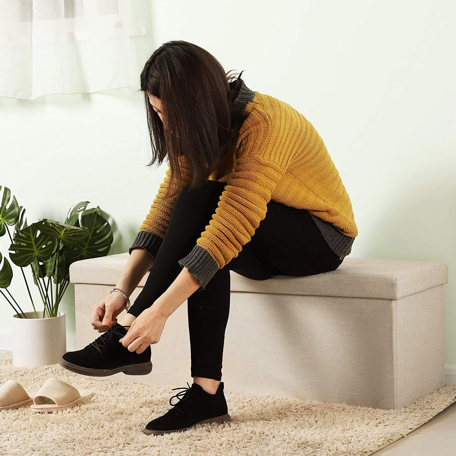 STURDY WITH STATIC BEARING CAPACITY UP TO 300 kg: Quality E1 grade MDF board construction gives you a solid and durable storage ottoman; high end imitation linen fabric and sponge padding with good elasticity bring soft and comfortable seating; easily holds 2-3 persons