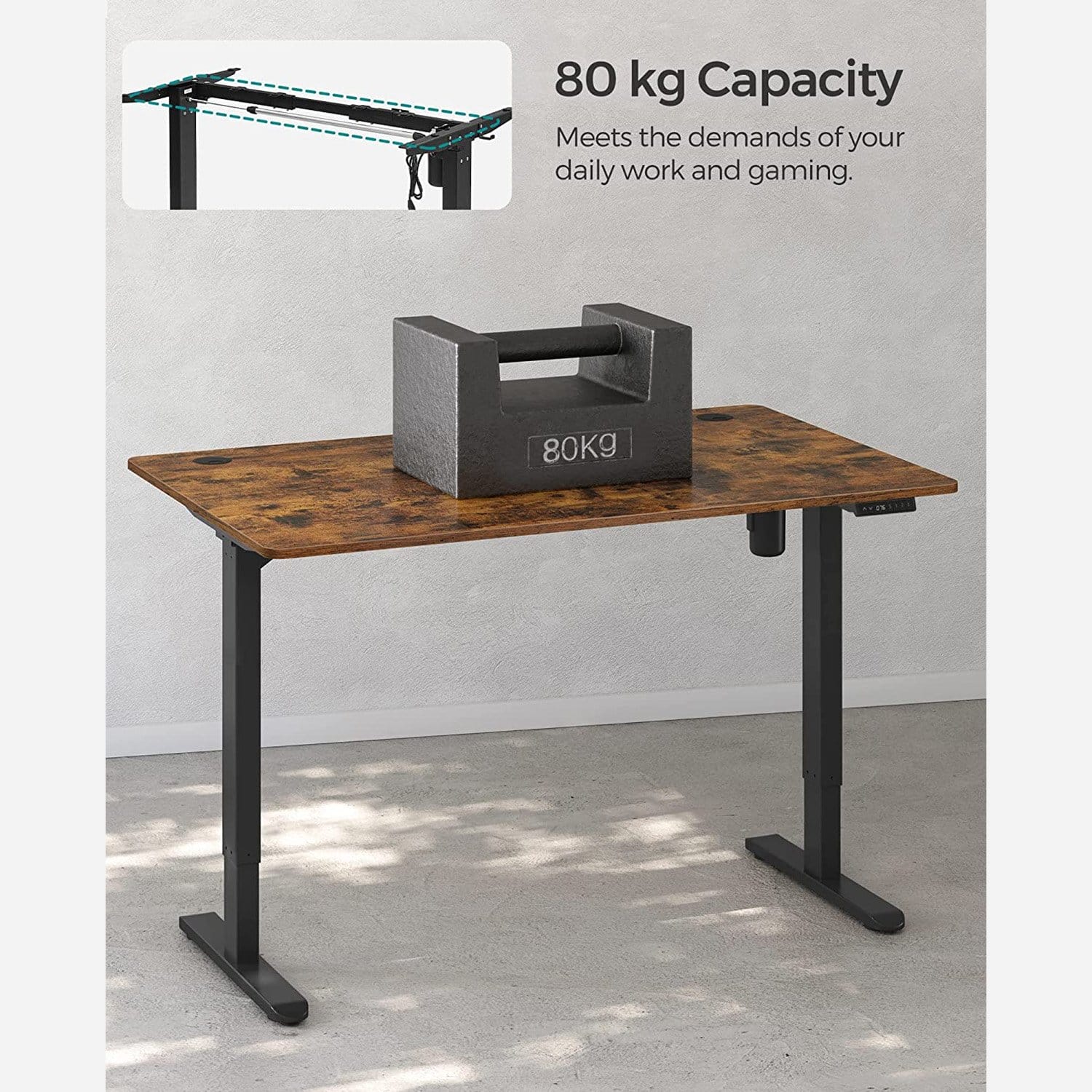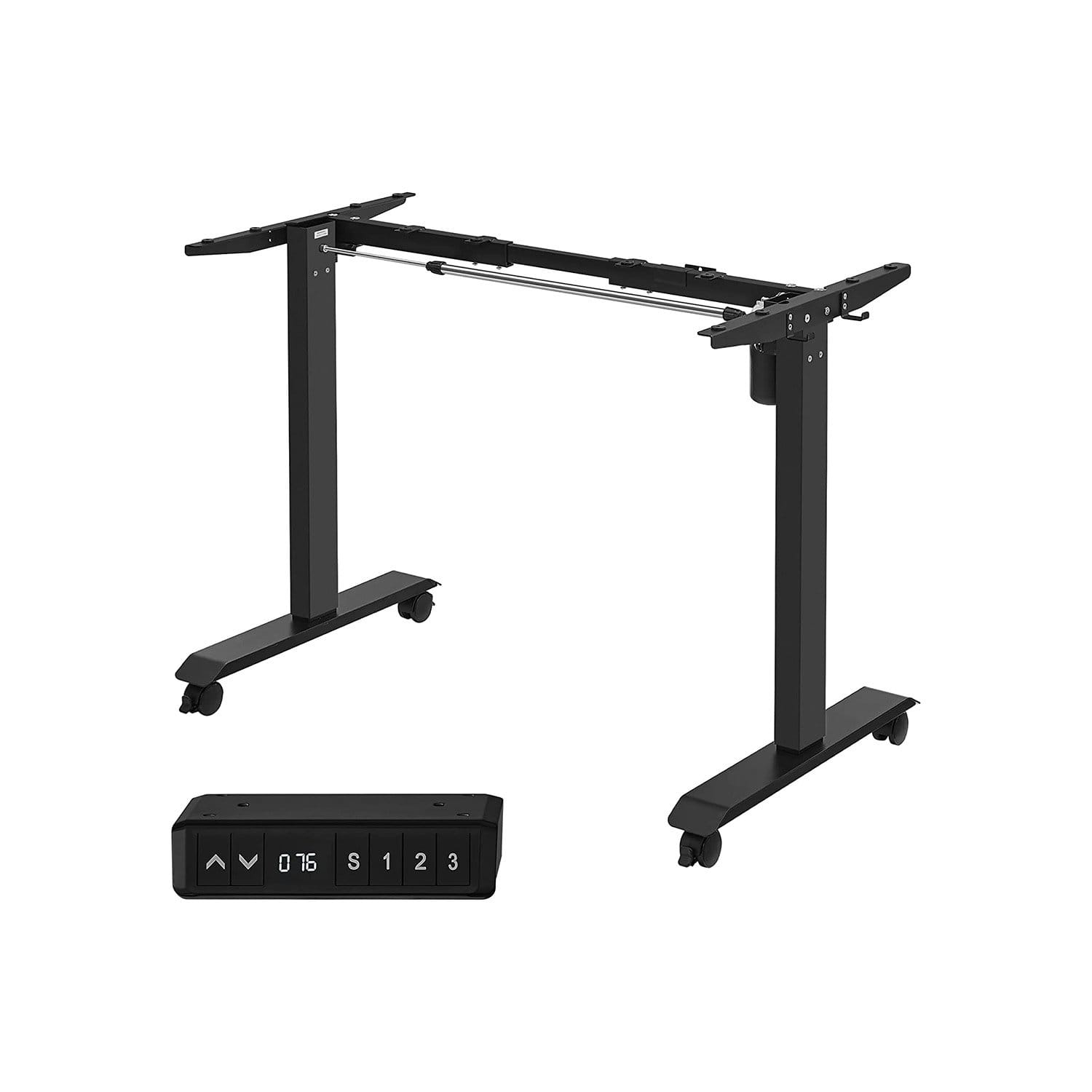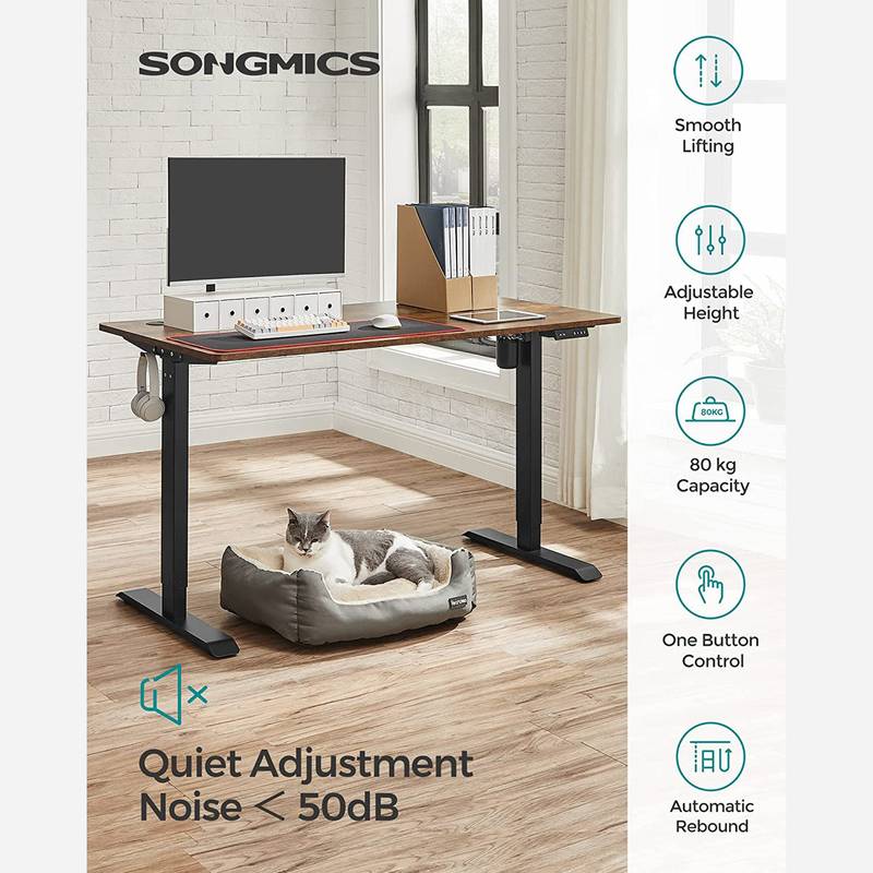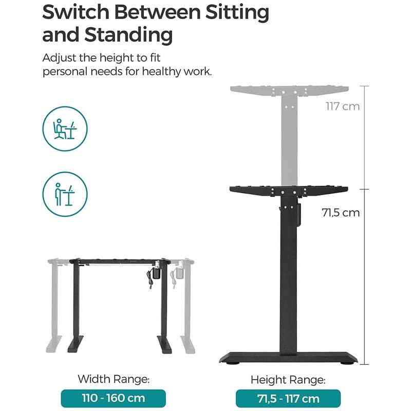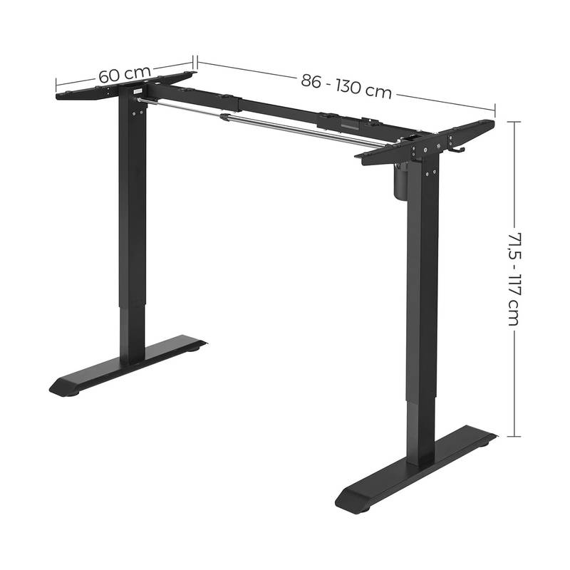 No noise: with high-quality motor guarantees quiet and gentle height adjustment, the adjustment speed is 25 mm/s, the noise level is low (< 50 dB), so you can continue working or learning undisturbed Adjustable table frame: this sturdy steel table frame is adjustable in length between 86 and 135 cm and therefore fits a variety of table tops (110-160 cm long, 60-80 cm wide) Product Details:Color: BlackMaterial: steelSize: 60 x (86-135) x (73-118) cm (D x W x H)Height adjustment: 73-118 cmLoudness: