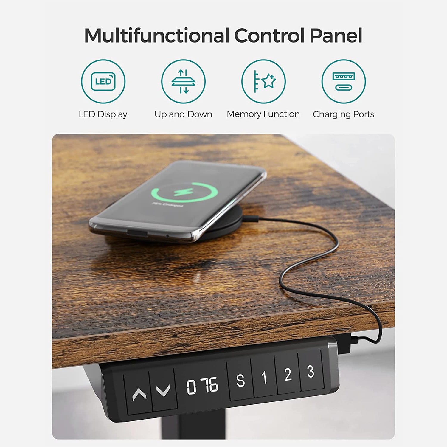 Practical design: with the buttons you save 3 heights; with USB and TYPE-C port, you can charge your devices; for safety reasons, the height adjustment stops and retracts the table slightly when it hits an obstacle when driving