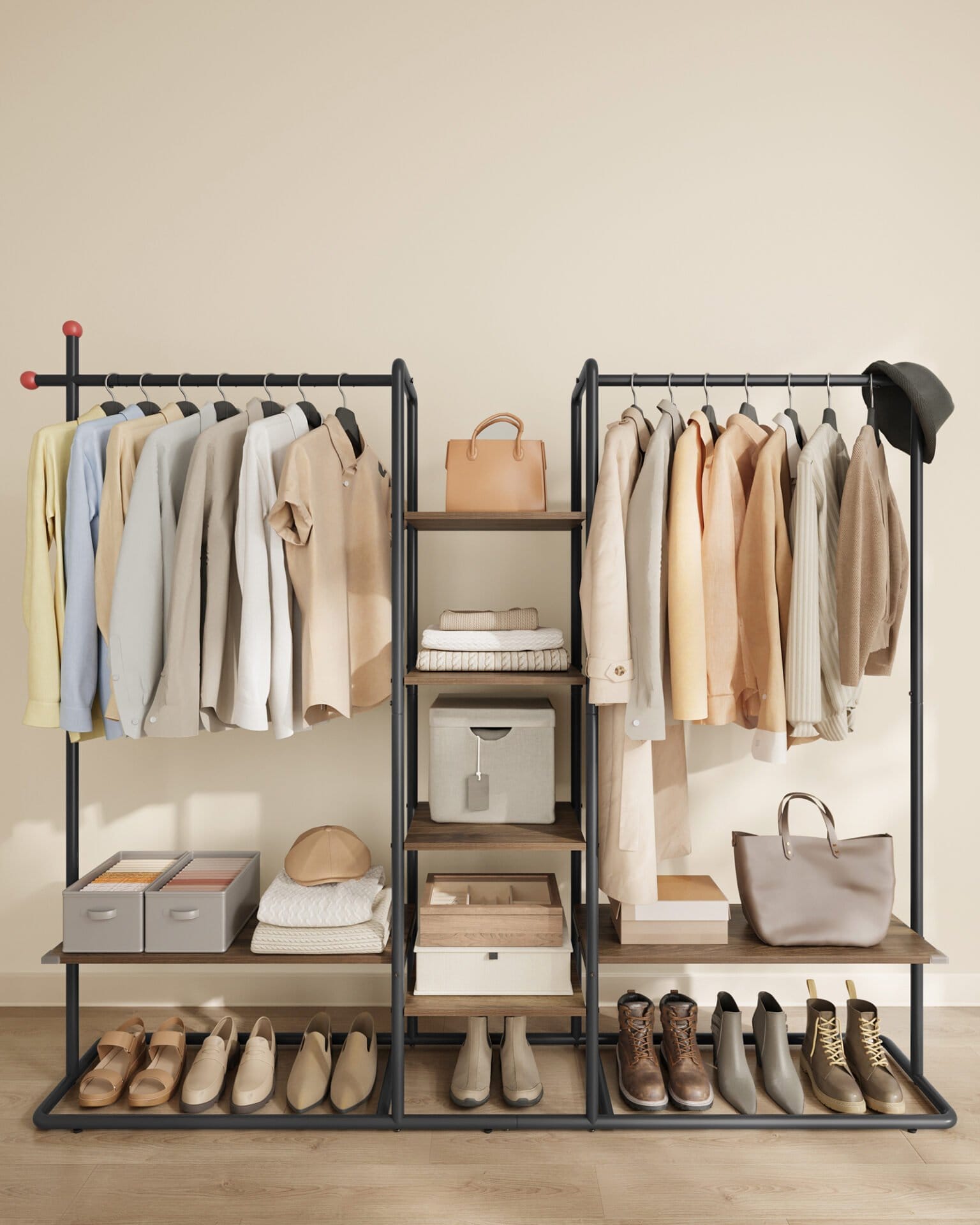 【STURDY AND DURABLE】Constructed with robust steel and quality particleboard, this clothes rack can support up to 136 kg in total. You can confidently hang your heavy winter coats without worry