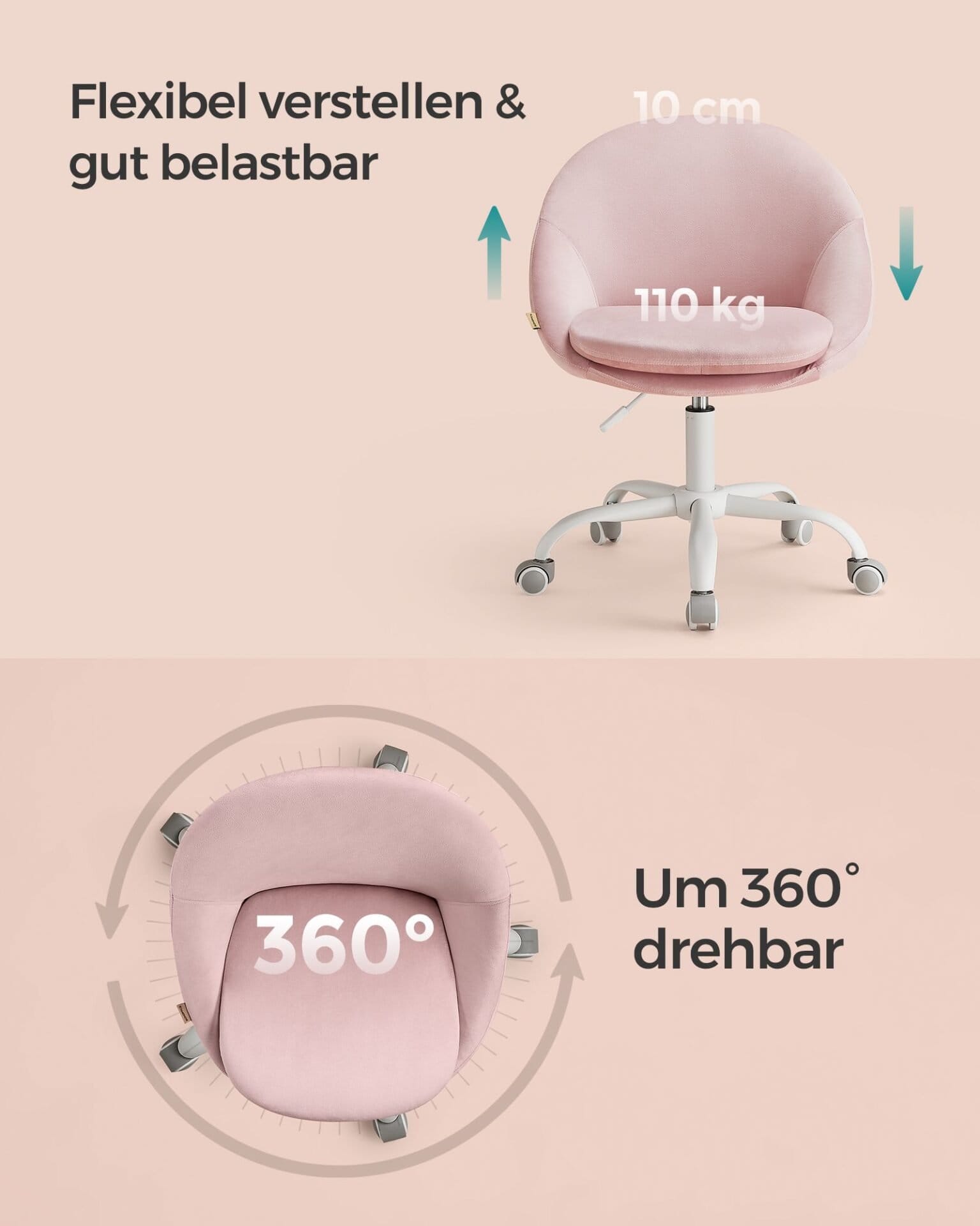 [Space-saving] This compact 360° rotating desk chair (60 x 60 cm) is height adjustable by 10 cm and has no armrests. When not in use, you can slide the chair under the desk to save space