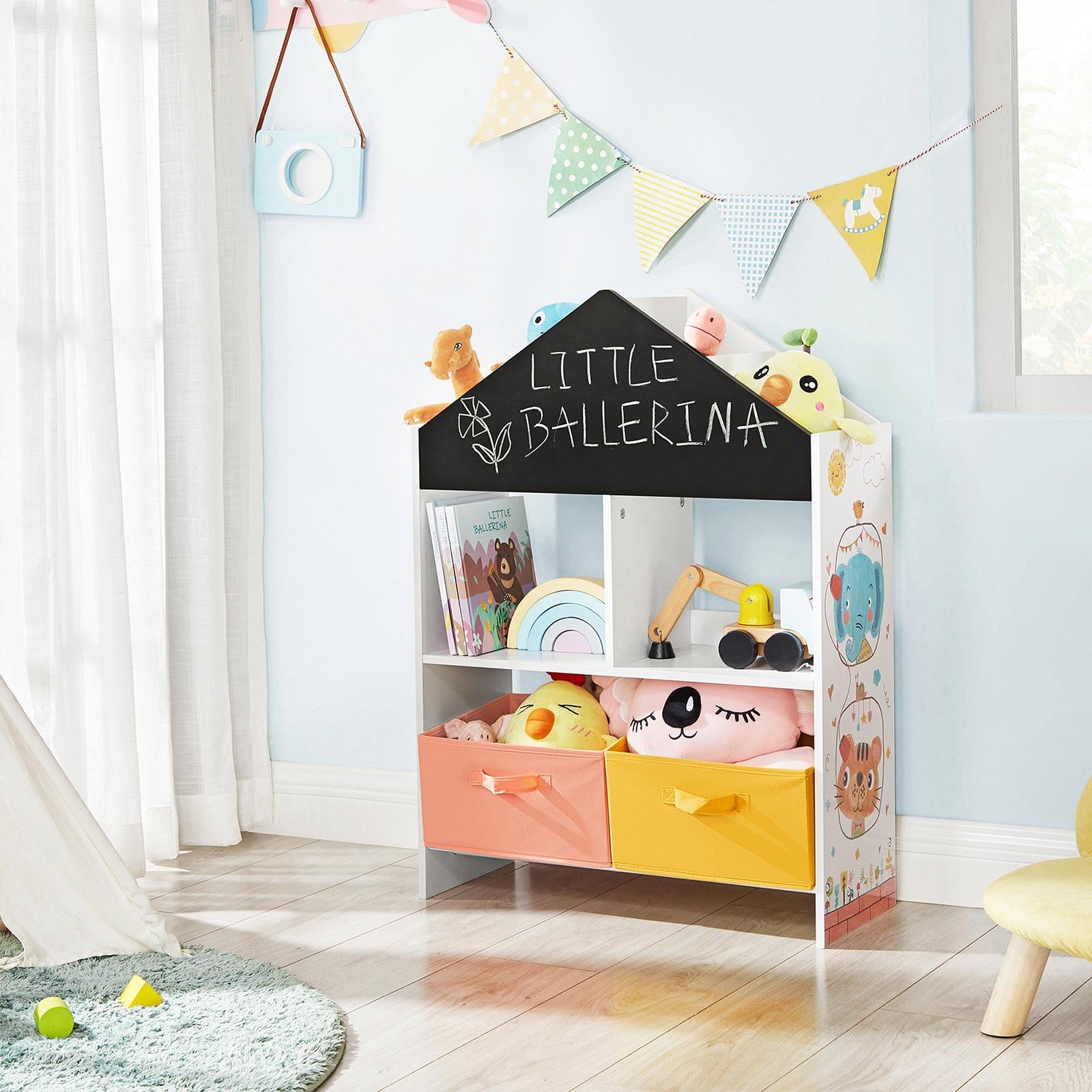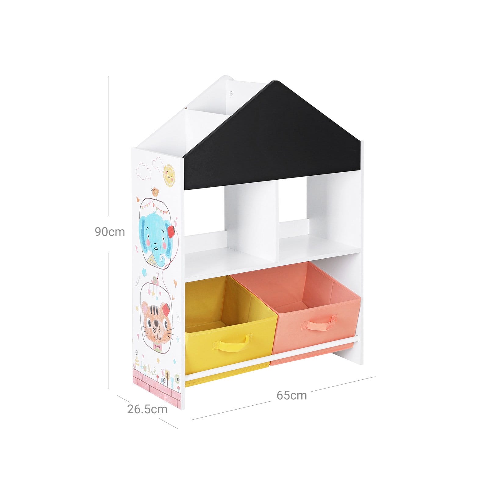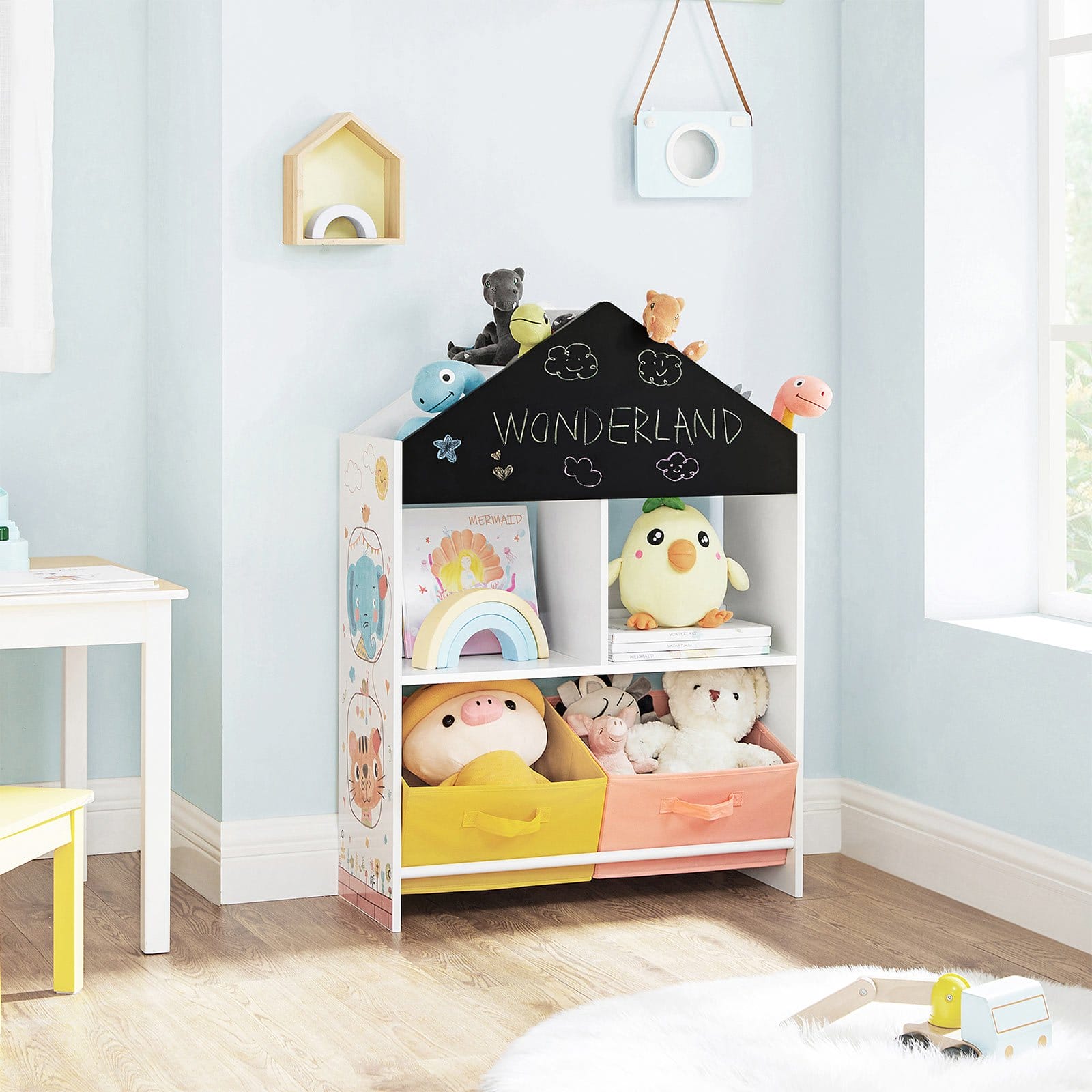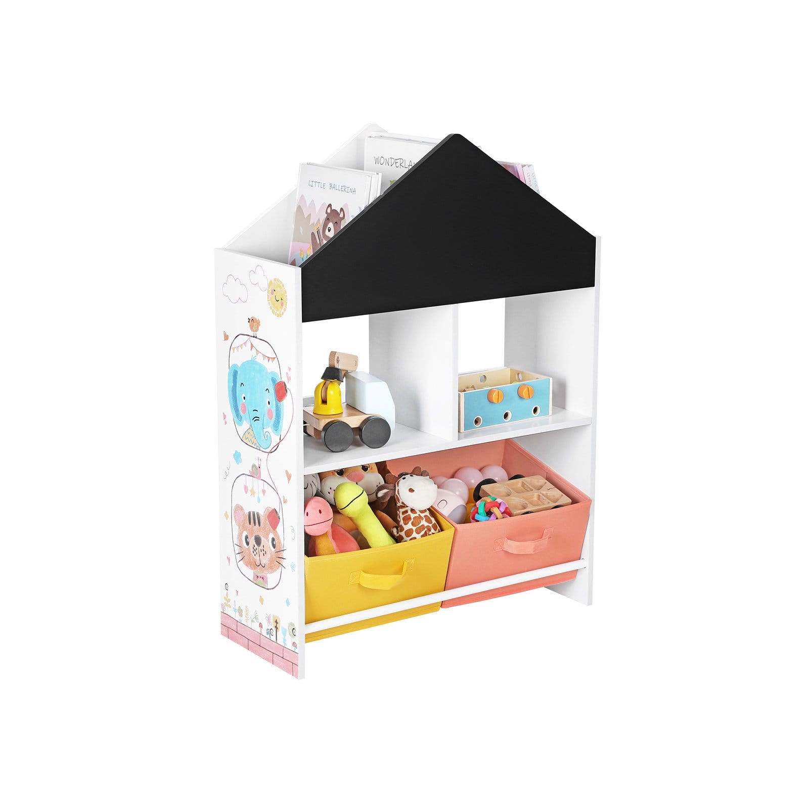 One for All Uses: 4 slots for toys, 2 shelves for picture books, 2 fabric boxes for art supplies, and plus a blackboard on the front of the roof for scribbles—a storage unit that lets your kids draw pictures and organise their items with minimal mess!