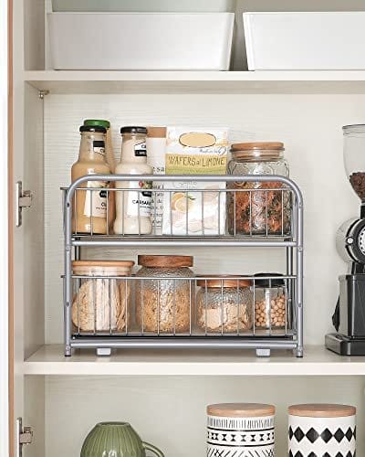 [Hvad får du] en køkkenarrangør med 2 hylder og 4 skridsikre plastfødder, der beskytter toppen mod ridser og giver ekstra stabilitet og 2 udtræksskuffer til opbevaring af dine ting