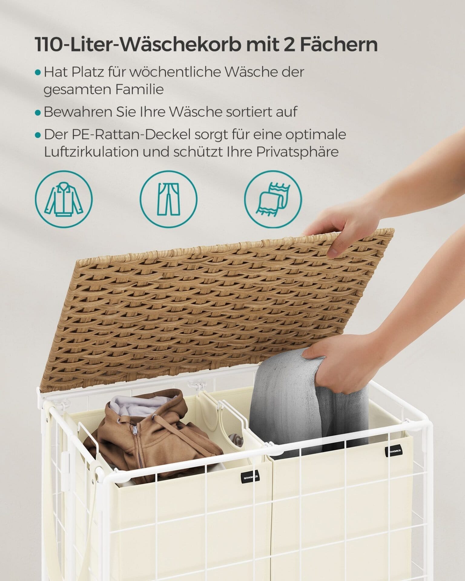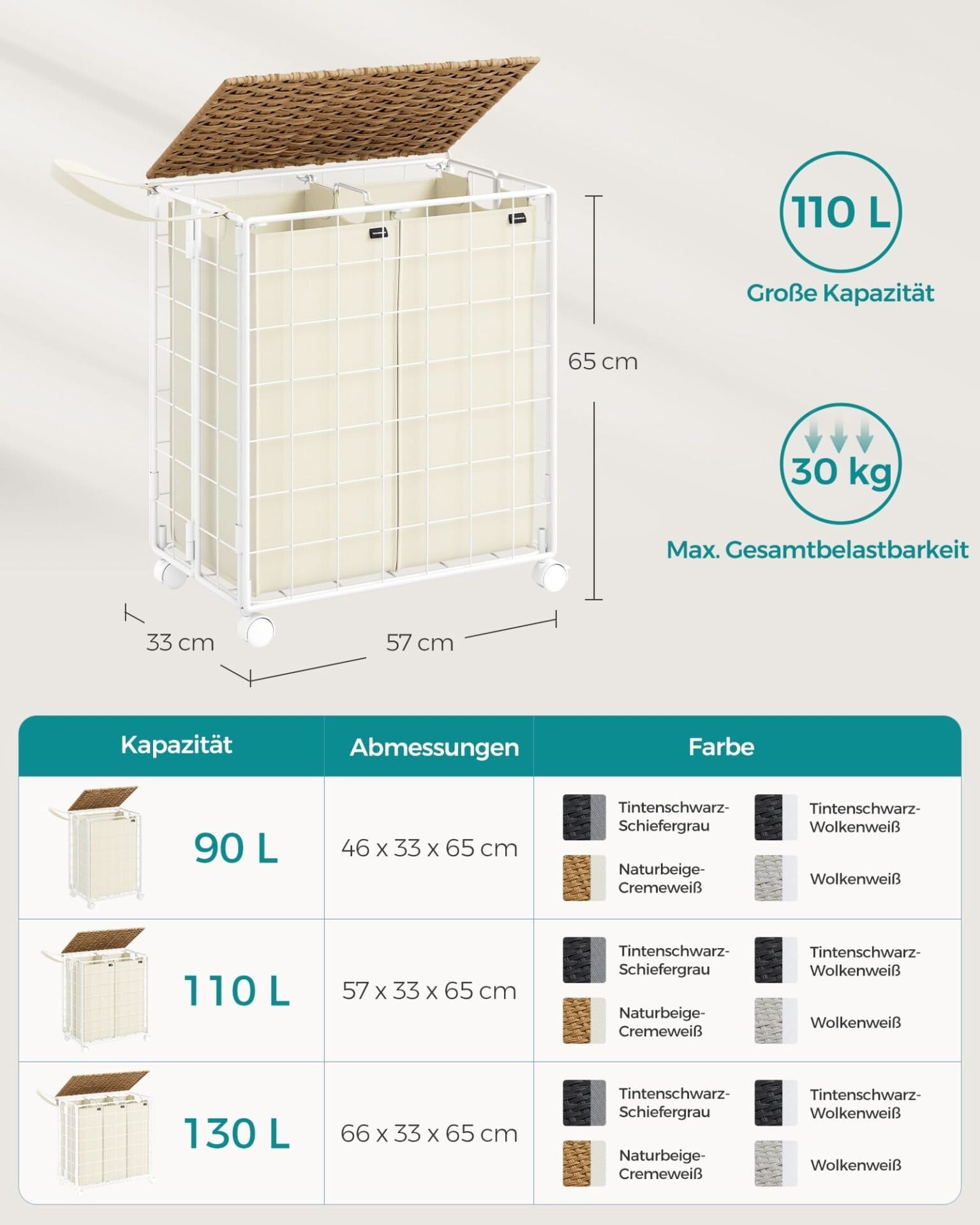 Ruim: met de afmetingen 57 x 33 x 65 cm biedt deze 110 liter wasmand met deksel voldoende opbergruimte voor vuile was van een week van het hele gezin en voor handdoeken, dekens, beddengoed of kussens