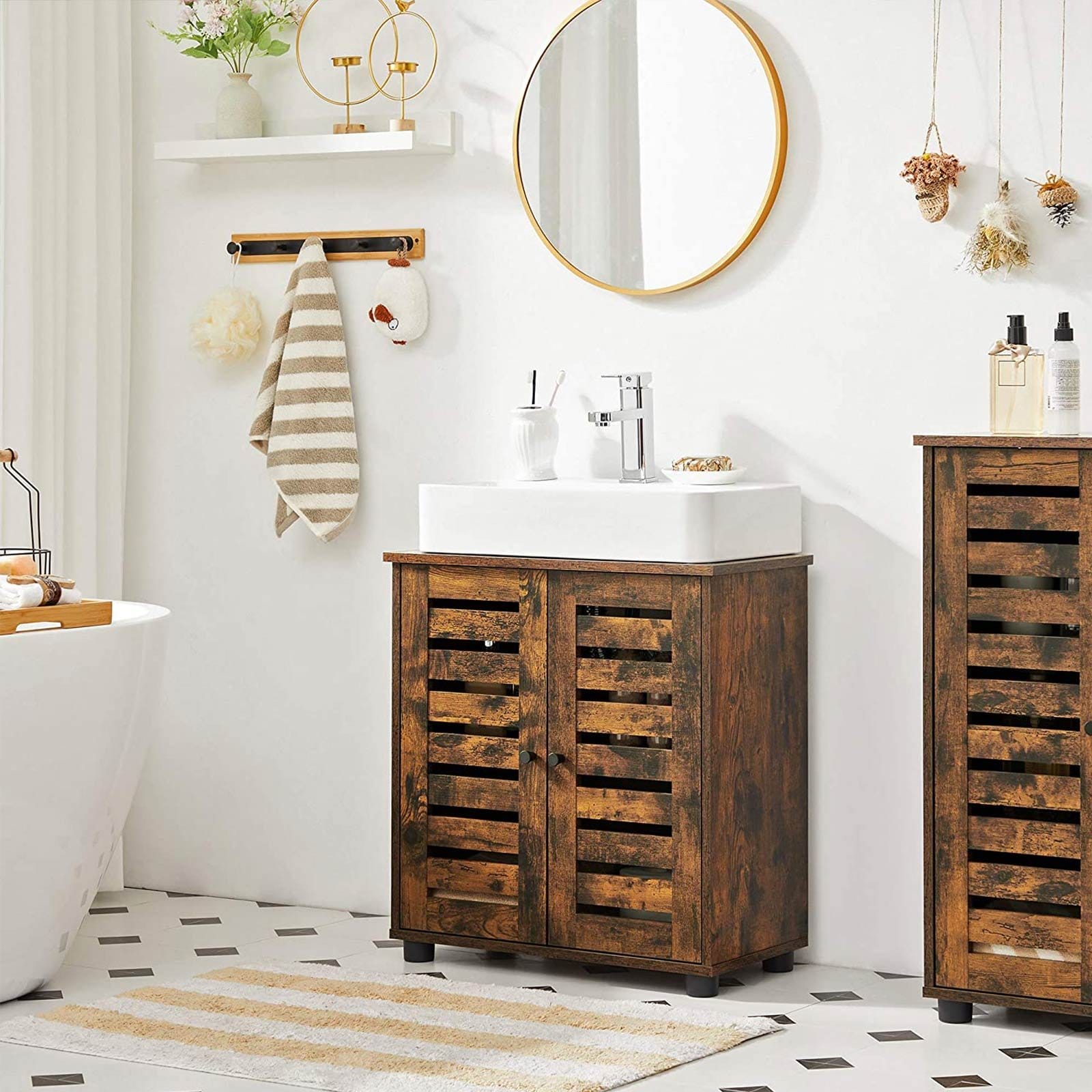 Rustic in the Bathroom: And why not? It’s the best way to bring a big dose of timeless charm and character to your bathroom. With this brown under sink cabinet with rustic accents, it’ll look like no other!