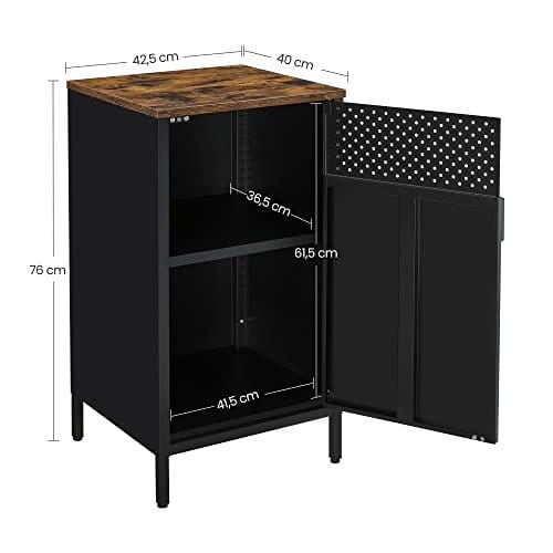 Specifikationer: Farve: Rustik Brown, BlackMaterial: ParticleBoard, Steelproduct Størrelse: 16,7 ”L x 15,7” W x 29,9 ”H (42,5 x 40 x 76 cm) Produktvægt: 24 lb (10,9 kg) maks. Statisk belastningskapacitet på toppen: 110 lb (50 kg) Pakkeindhold: 1 x Opbevaringsskab1 x Tilbehør Kit1 x Anti-Tip Kit1 X Instruktioner