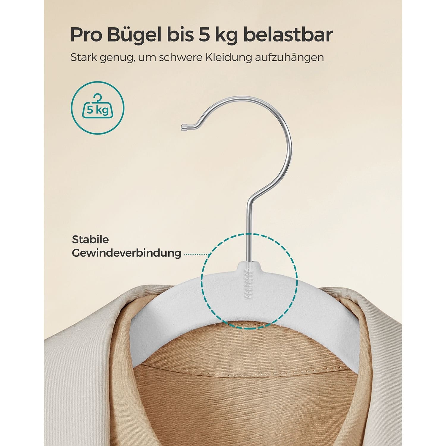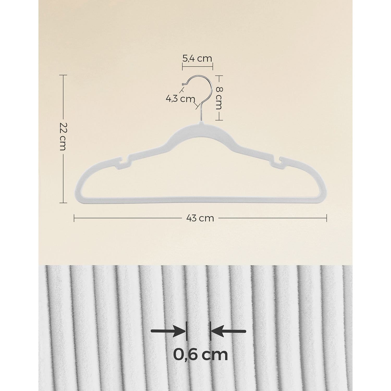 Specifications:Colour: WhiteMaterial: Velvet, ABS Plastic, Metal HookSize of Each Hanger: 43 x 0.6 x 22 cm (L x W x H)Total Weight of 30 Hangers: 2.2 kgMax. Static Load Capacity per Hanger: 5 kgPackage Contents:30 x Velvet Hanger