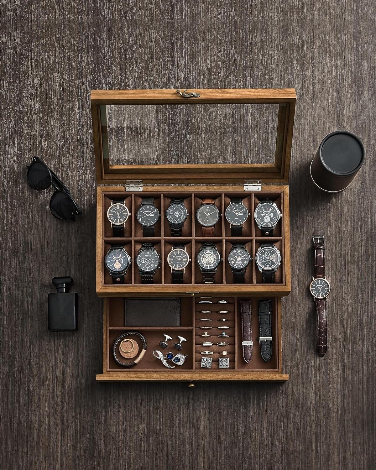 Urkasse med 12 pladser, 2-lags træurkasse, glaslåg, smykkeskrin, rustik valnød