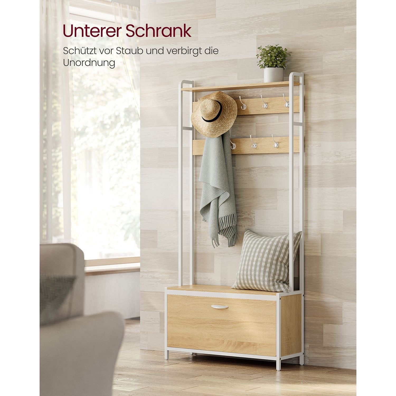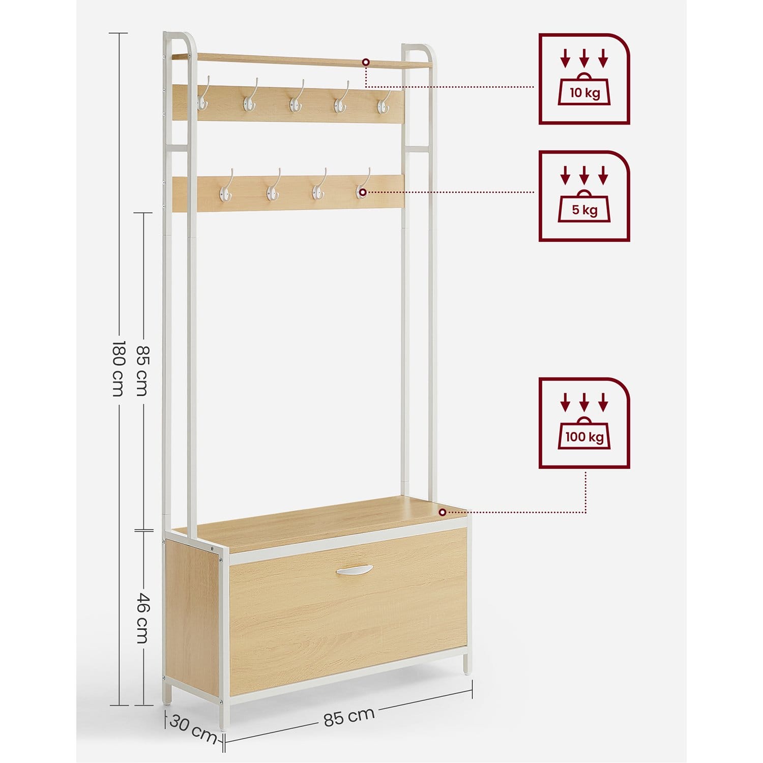 Sturdy: Thanks to the steel and chipboard construction and V-struts on the back, this coat stand is robust and stable (bench can hold up to 100 kg). Simply sit on the bench to put on shoes comfortably
