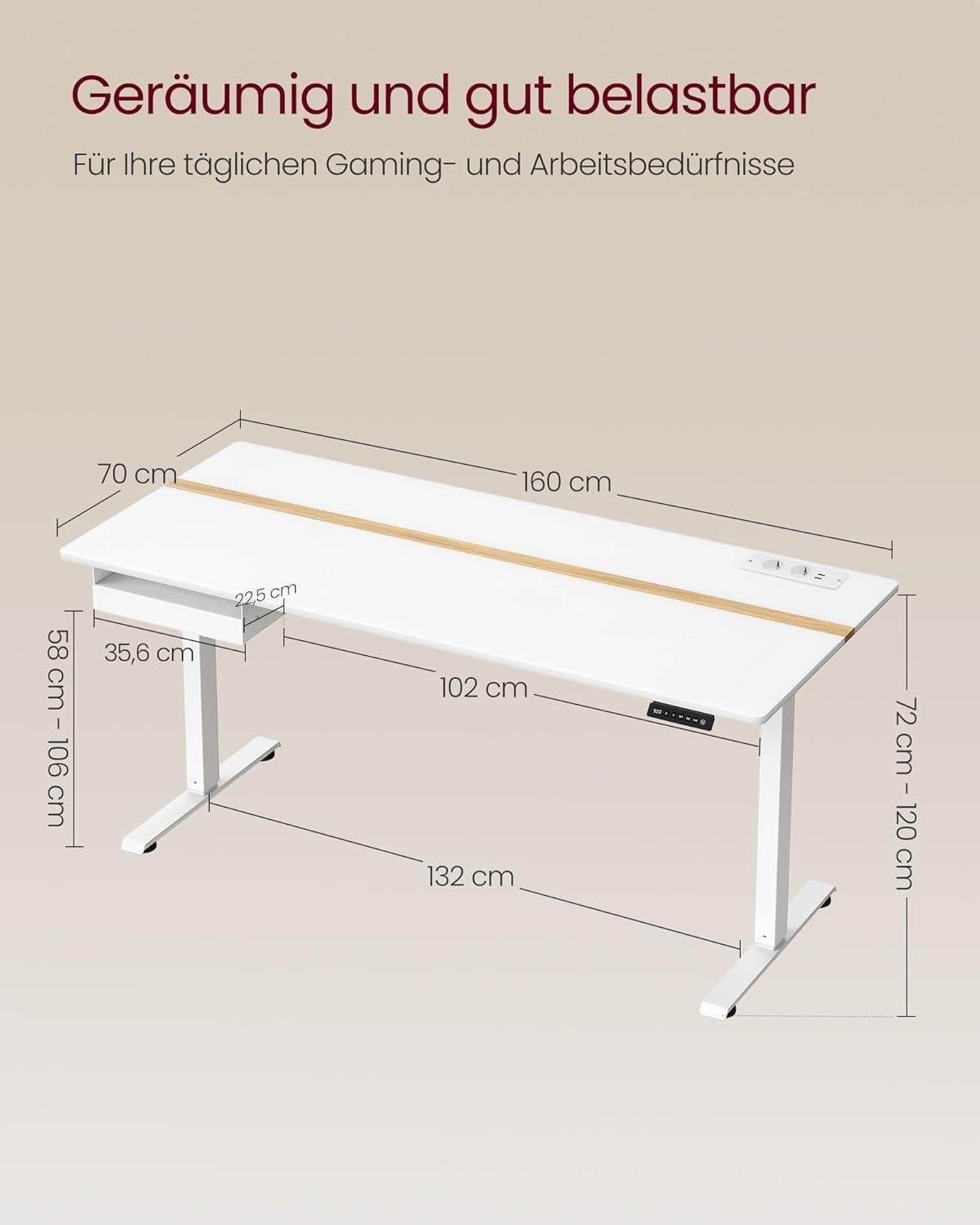 Adjustable height and memory function: This table is smoothly height-adjustable between 72 and 120 cm and has a very low noise level when adjusting the height (< 50 dB). A total of 4 heights can be saved as a quick setting. Built-in socket and integrated wiring: With 2 charging sockets (220V–250V, 15A–16A) and 2 USB ports; thanks to the integrated wiring, only one cable is required to connect the power for the motor and charge your devices together. Spliced table top: Different colours and appropriate splicing proportions add style to this desk and create a productive working atmosphere. Drawer and hook: A small drawer (22.7 x 32.5 x 4 cm) for office supplies, the top of the drawer for laptop or documents; the side hook can be used for hanging headphones to make it easier to access. Robust and stable: Double support bars and robust legs provide stable support (up to 80 kg); the adjustable feet can be replaced by 4 wheels with brakes, thanks to the brakes, you don't have to worry about stability. Product Details:Color: Cloud White-Golden OakMaterial: Particleboard, SteelSize: 70 x 160 x (72-120) cm (D x W x H)Tabletop Thickness: 1.5 cmNoise Level: <50 dBAdjustment Speed: 25 mm/sWeight: 34.1 kgMax. Static Load Capacity: 80 kgIncluded:1 x Desk1 x Controller1 x Drawer1 x Power Socket1 x Hook4 x Casters1 x Accessory Kit1 x Instructions