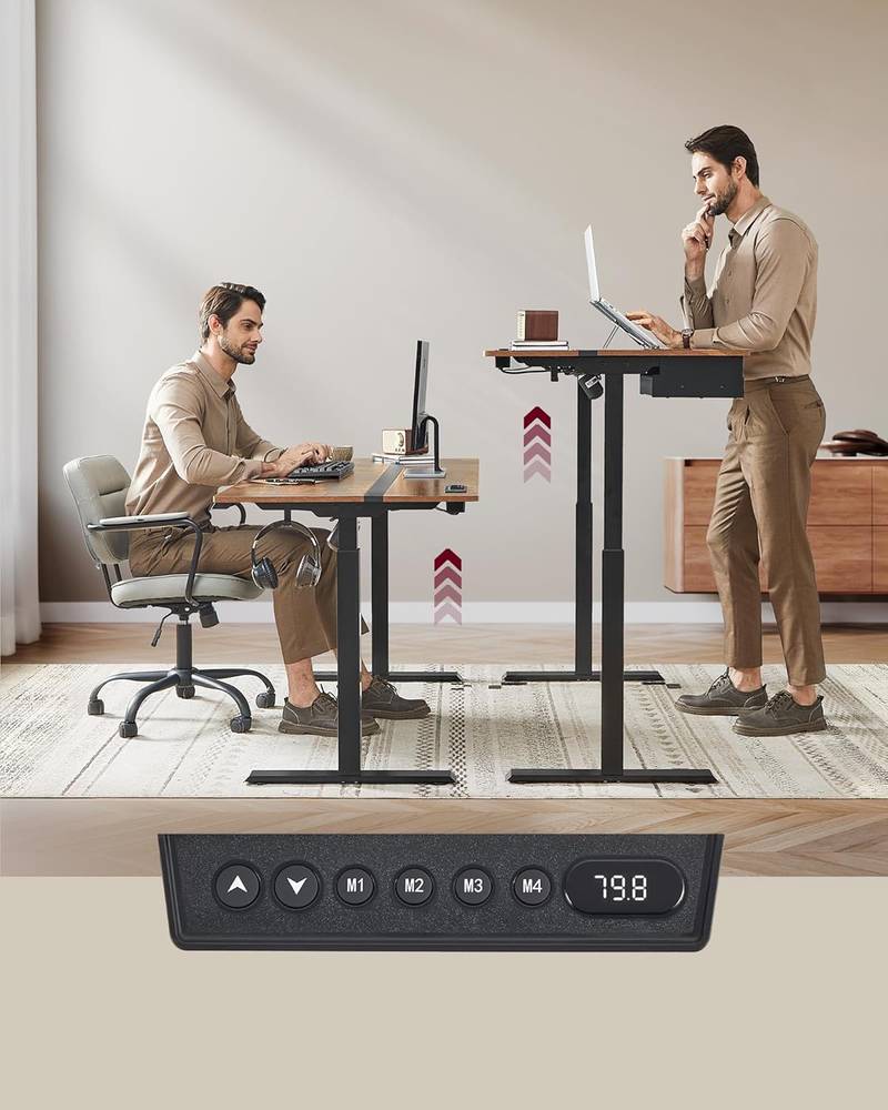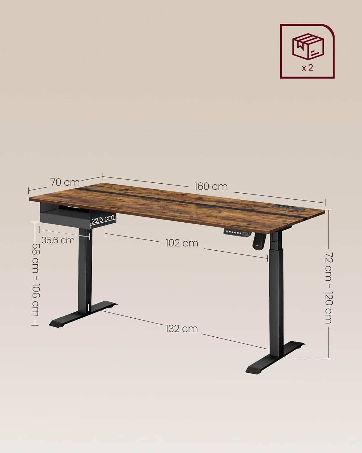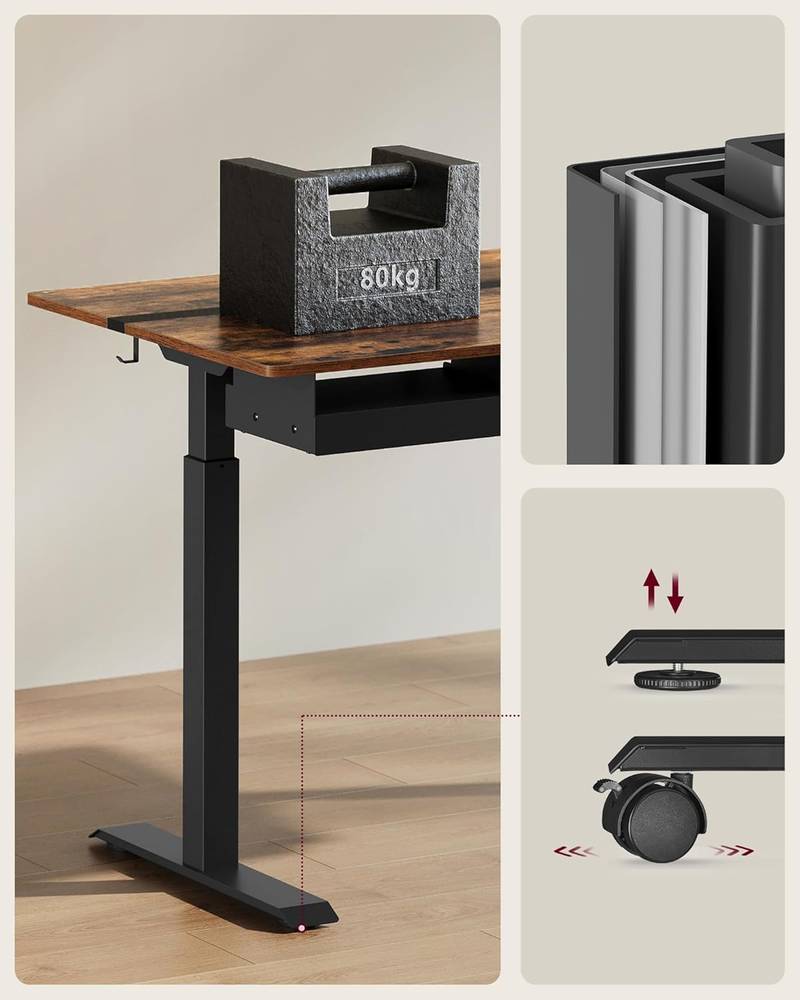 [Adjustable Height & Memory Function] This table is infinitely height adjustable between 72 and 120 cm and has a very low noise level when adjusting the height (< 50 dB). A total of 4 heights can be saved as a quick setting Built-in socket and integrated wiring: With 2 charging sockets (220V-250V, 15A-16A) and 2 USB ports; thanks to the integrated wiring, only one cable is required to connect the power for the motor and charge your devices together [Spliced Table Top] Different colors and appropriate splicing proportions add style to this desk stand and create a productive working atmosphere [Drawer & Hook] A small drawer (22.7 x 32.5 x 4 cm) for office supplies, the top of the drawer for laptop or documents; the side hook can be used for hanging headphones to make it easier to access [Robust & Stable] Double support bars and robust legs provide stable support (up to 80 kg); the adjustable feet can be replaced by 4 wheels with brakes, thanks to the brakes, you don't have to worry about stability Product details:- Colour: vintage brown ink black.- Material: wood chipboard, steel.- Size: 70 x 160 x (72-120) cm (D x W x H).- Thickness of the tabletop: 1.5 cm.- Volume: <50 dB.- Adjustment speed: 25 mm/s- Weight: 34.1 kg.- Max. Static load capacity: 80 kg.Package includes:- 1 x desk.- 1 x controller.- 1 x drawer.- 1 x socket.- 1 x hook.- 4 x wheels.- 1 x accessory pack.- 1 x instruction manual (English language