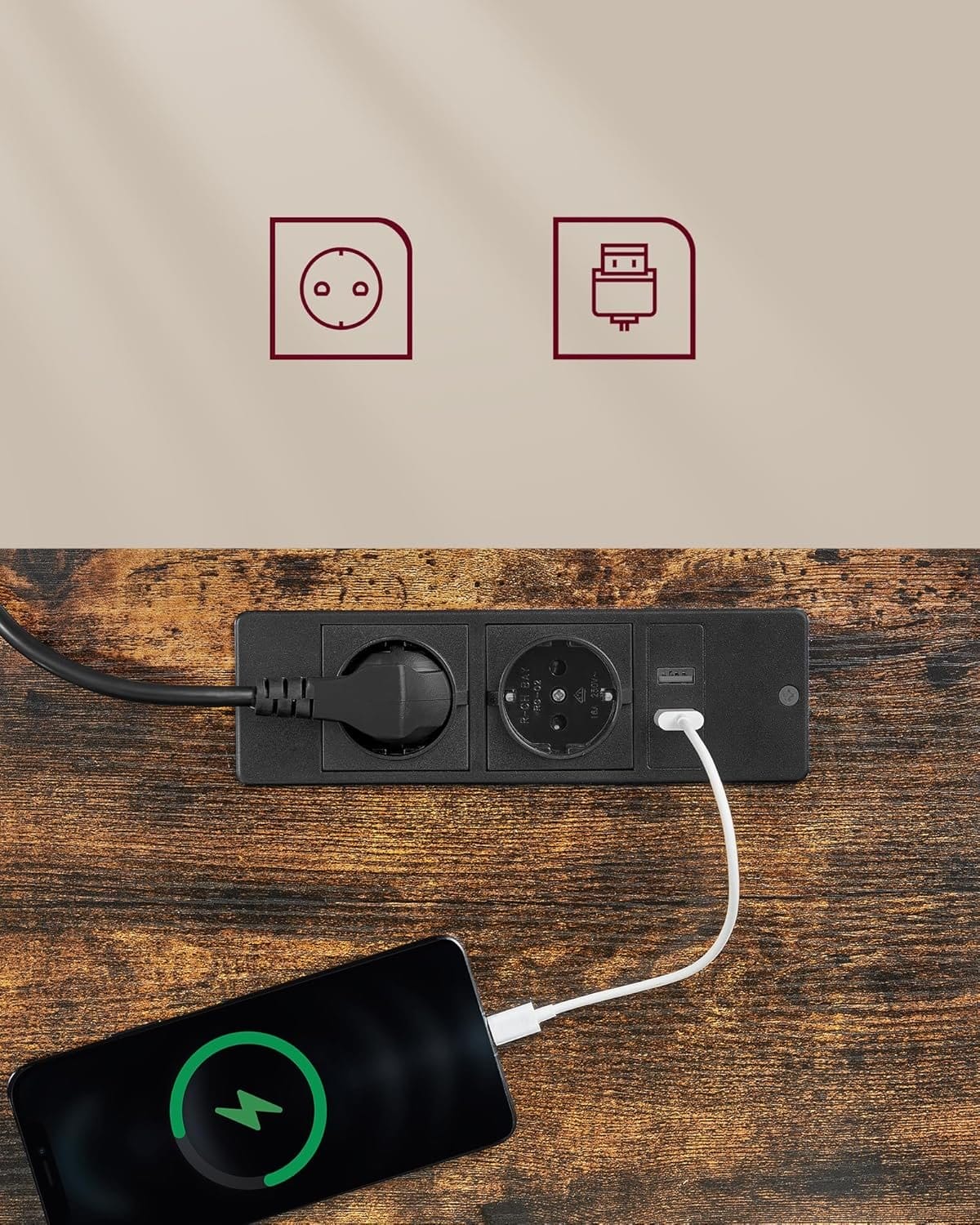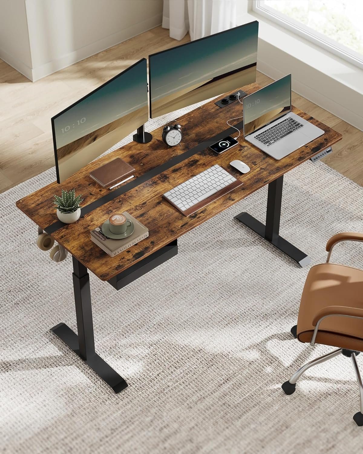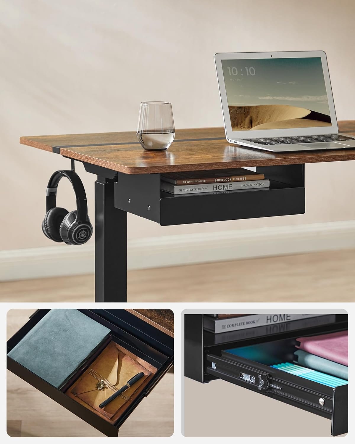 [Adjustable Height & Memory Function] This table is infinitely height adjustable between 72 and 120 cm and has a very low noise level when adjusting the height (< 50 dB). A total of 4 heights can be saved as a quick setting Built-in socket and integrated wiring: With 2 charging sockets (220V-250V, 15A-16A) and 2 USB ports; thanks to the integrated wiring, only one cable is required to connect the power for the motor and charge your devices together [Spliced Table Top] Different colors and appropriate splicing proportions add style to this desk stand and create a productive working atmosphere [Drawer & Hook] A small drawer (22.7 x 32.5 x 4 cm) for office supplies, the top of the drawer for laptop or documents; the side hook can be used for hanging headphones to make it easier to access [Robust & Stable] Double support bars and robust legs provide stable support (up to 80 kg); the adjustable feet can be replaced by 4 wheels with brakes, thanks to the brakes, you don't have to worry about stability Product details:- Colour: vintage brown ink black.- Material: wood chipboard, steel.- Size: 70 x 160 x (72-120) cm (D x W x H).- Thickness of the tabletop: 1.5 cm.- Volume: <50 dB.- Adjustment speed: 25 mm/s- Weight: 34.1 kg.- Max. Static load capacity: 80 kg.Package includes:- 1 x desk.- 1 x controller.- 1 x drawer.- 1 x socket.- 1 x hook.- 4 x wheels.- 1 x accessory pack.- 1 x instruction manual (English language