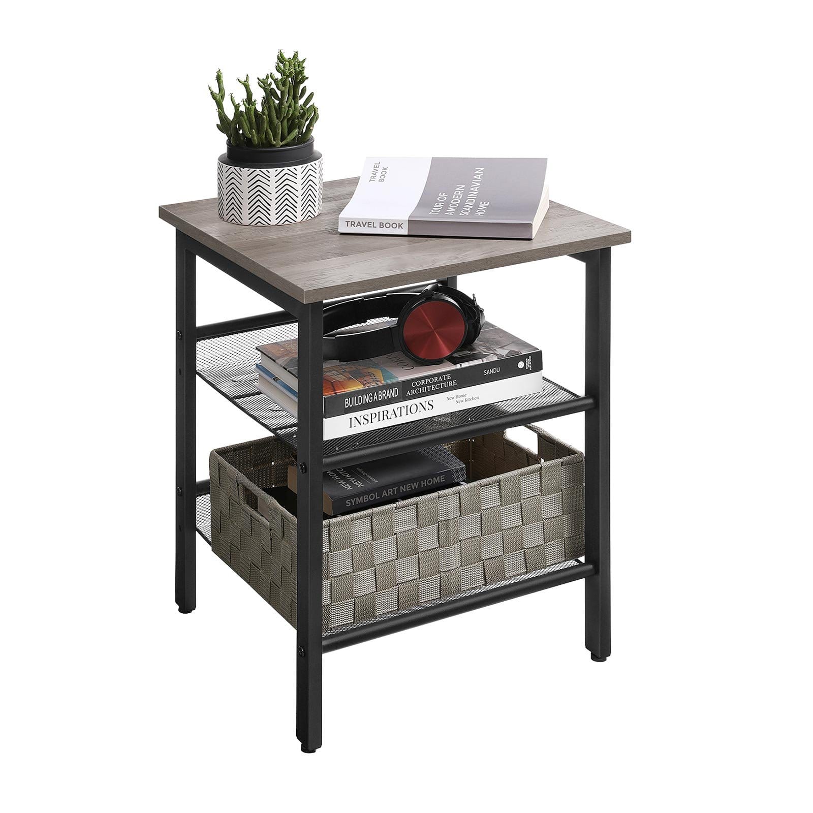 Specifications:Color: Greige, BlackMaterial: Particleboard, SteelProduct Size: 15.7”L x 15.7”W x 21.7”H (40 x 40 x 55 cm)Product Weight: 8.4 lb (3.8 kg)Max. Static Load Capacity of the Tabletop: 44 lb (20 kg)Max. Static Load Capacity per Mesh Shelf: 11 lb (5 kg)Package Contents:1 x Side Table1 x Accessory Kit1 x Instructions