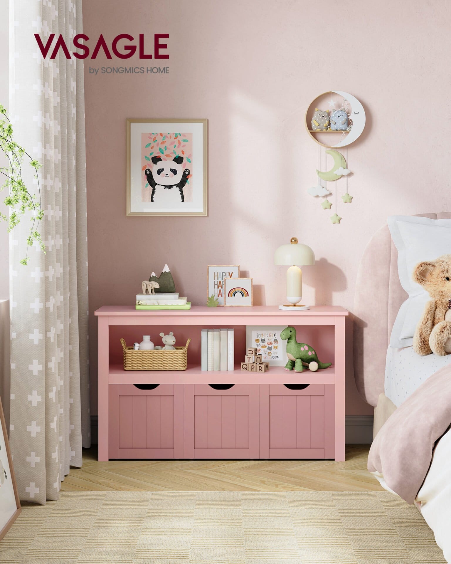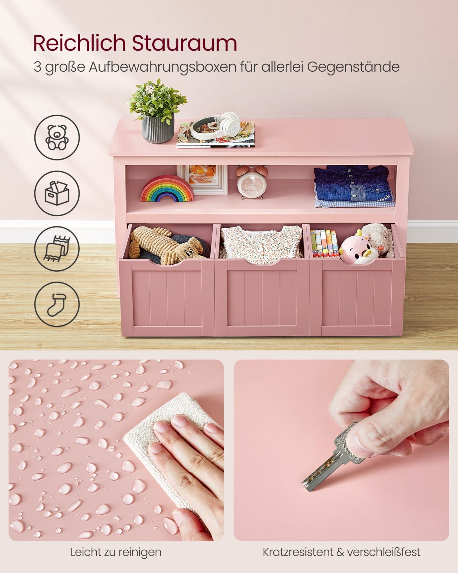 【CHILD-FRIENDLY DESIGN】Each of the 3 removable storage boxes has 4 wheels, so your little one can pull them out easily. The cutout handles prevent pinching their little hands, and the 60 cm height make it easier for them to reach their items